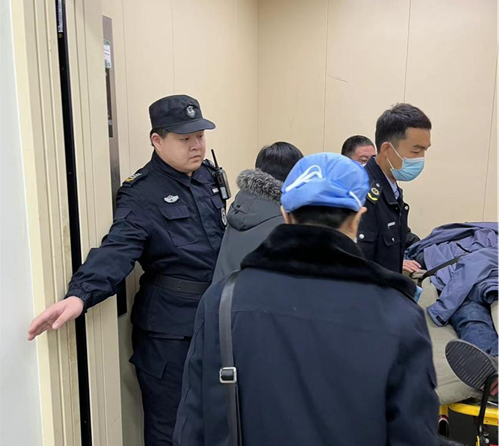 當(dāng)天上午,正在政務(wù)中心南門執(zhí)勤的保安員周彪和婁前松,發(fā)現(xiàn)一輛120救護(hù)車駛來,兩人便上前詢問情況,在得知六樓食堂有人突發(fā)心臟病后,第一時間將情況上報給了分隊長呂偉,呂偉得知情況后,考慮到救援人員攜帶擔(dān)架和急救設(shè)備等特殊情況,他迅速反應(yīng),指示周彪快速引導(dǎo)救援人員走距離最近的貨梯上樓,同時管控該貨梯此段時間使用。說話間,呂偉已經(jīng)同時趕到了事發(fā)地。